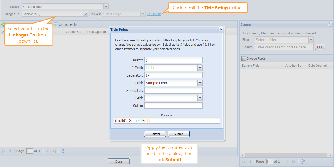In the Linkages To drop-down list, select your list. A link appears. Click it to open the Title Setup dialog once again.