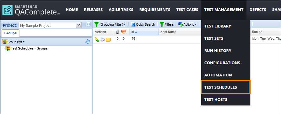 To access this screen, select Test Management > Test Schedules on the main QAComplete toolbar.