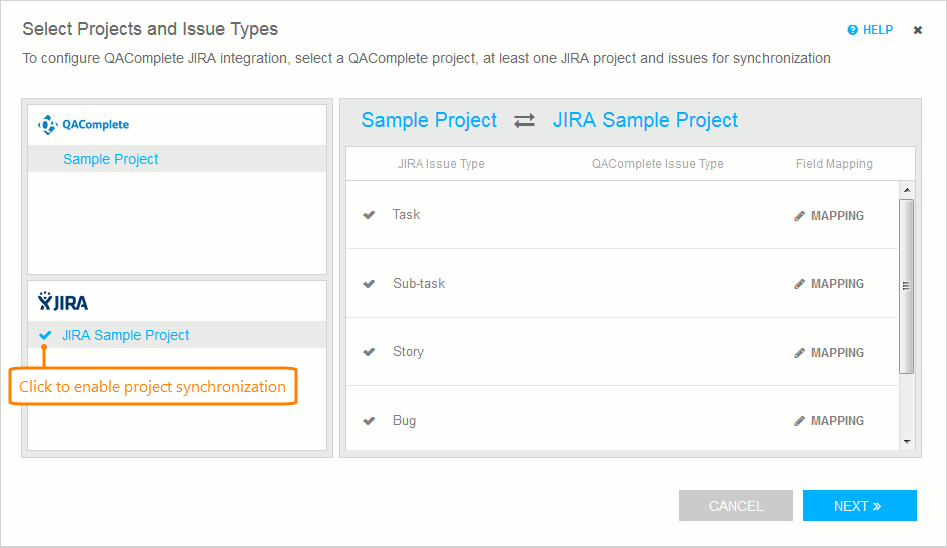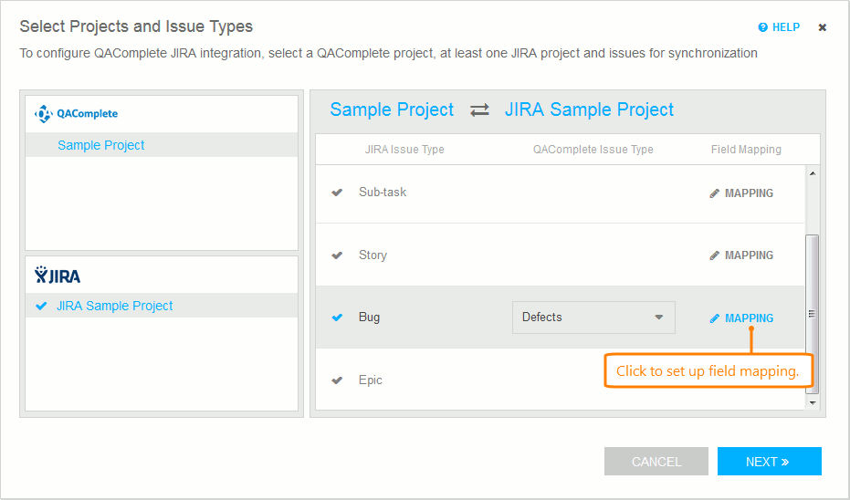 On the Select Projects and Issue Types page, you select QAComplete and JIRA projects that you want to synchronize and configure synchronization between their items.