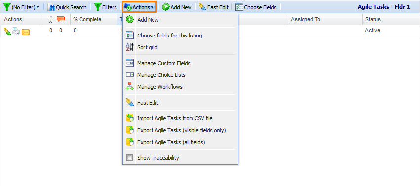 Click icons in the Actions column to perform various actions with the specific agile task: