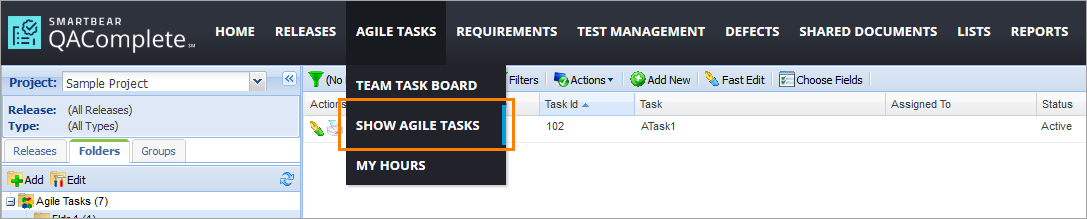 To access this screen, select Agile Tasks > Show Agile Tasks on the main QAComplete toolbar.