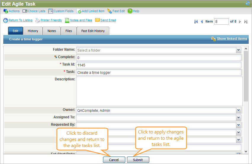 To apply the changes you have made, click Submit, or click Cancel to return back to the Agile Tasks screen.