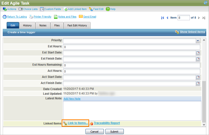 If you need to link some other items to the agile task (for example, requirements or releases), use the Linked Items panel on the Add Agile Task form or the Edit tab of the Edit Agile Task form. See Linked Items for more information.