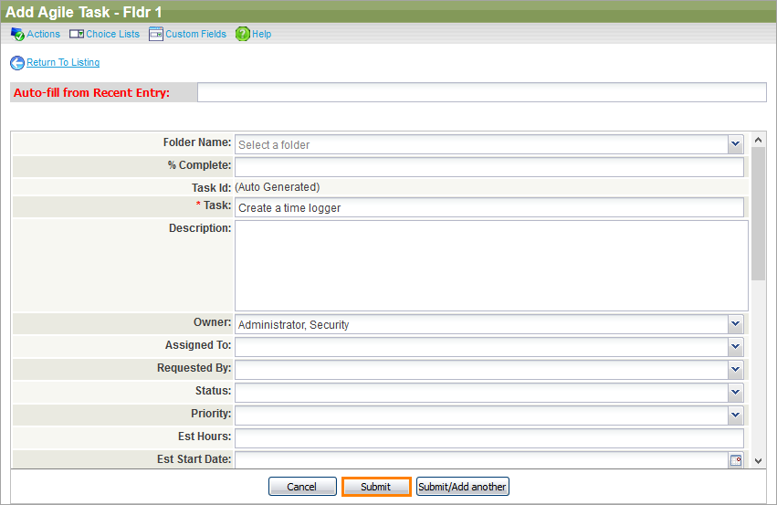 On the following Add Agile Task form, provide the necessary information about a new agile task. You can use auto-fill to quickly describe the task – to do that, just select a recent entry in the Auto-fill from Recent Entry drop-down list.