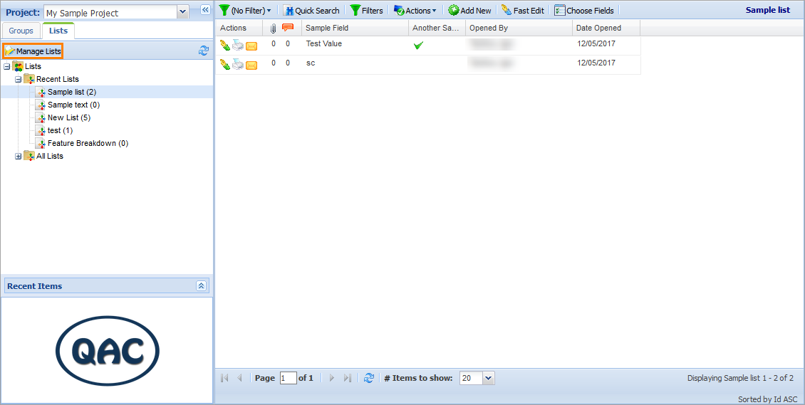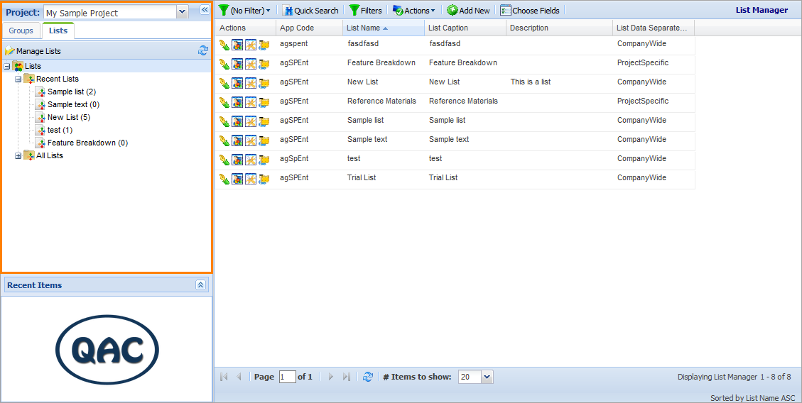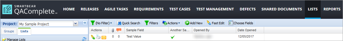 Use the navigation functionality to work with the lists available to you in QAComplete.