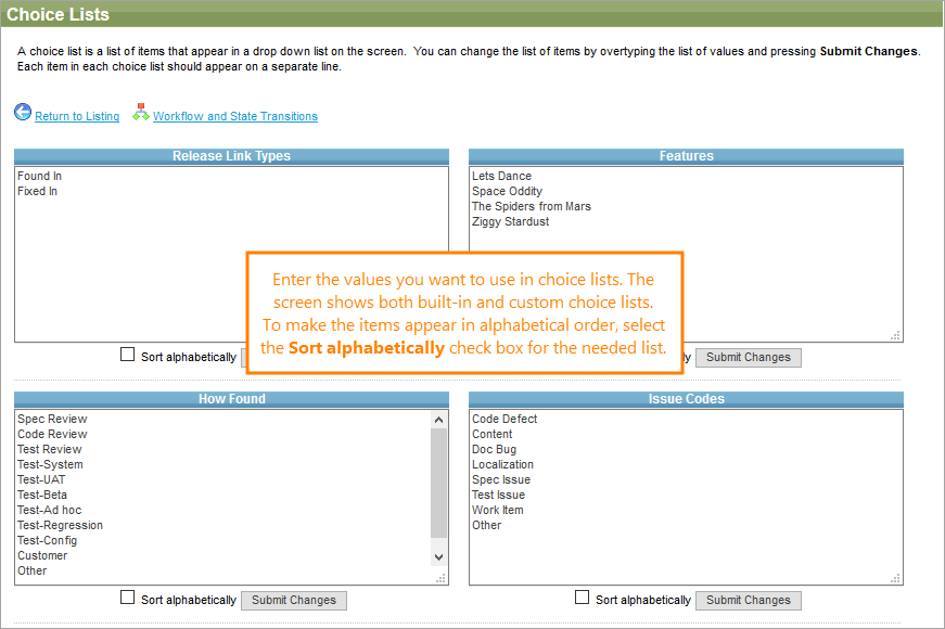 In QAComplete, choice lists are lists of items that appear in drop-down lists and combo boxes. You can change a list of items in any combo box.