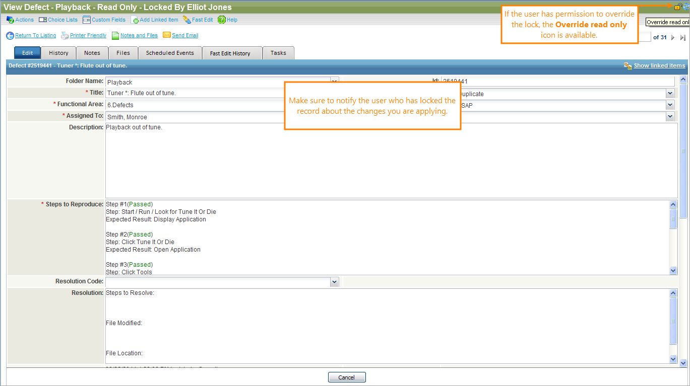 When a team member selects a requirement, test, defect, or other object for editing purposes, the record becomes locked. If the second team member opens up the same record, they will see a read-only version. The name of the person who has locked the record appears in the heading.