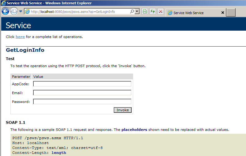 You can test the service by using the GetLoginInfo method. Locate the method on the page and click it: