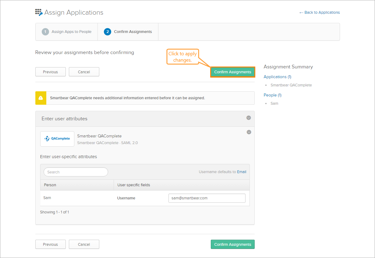 Single Sign-On;: Okta assignment confirmation screen