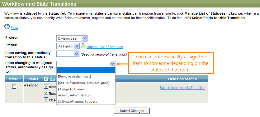 In the preceding example, you can also set Upon changing to Active status, automatically assign to to [Remove Assignment]. That way, it will automatically remove the assignment when it enters that status. This can be helpful for removing assignment when items are closed and in similar cases.