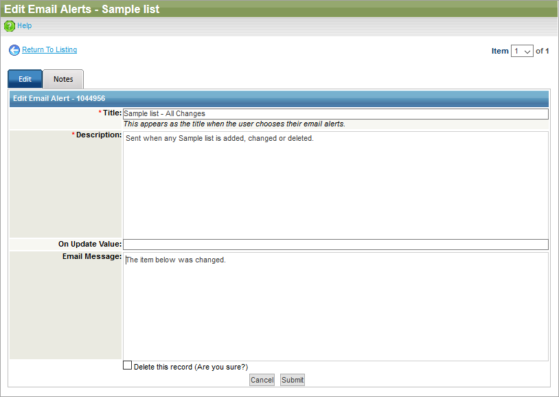 • In the subsequent Edit Email Alert form, make the changes you need.