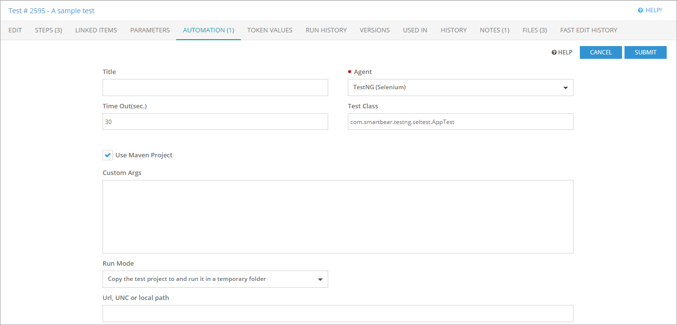 • You can leave the Title field blank, and the system will use the name of the attached Selenium test, or you can enter a meaningful title.