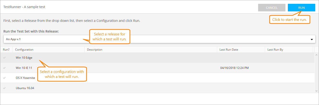 If the test is linked to a release, iteration, or build, select the needed item. If the test is linked to a configuration, select the check box next to the needed configuration, then click Run: