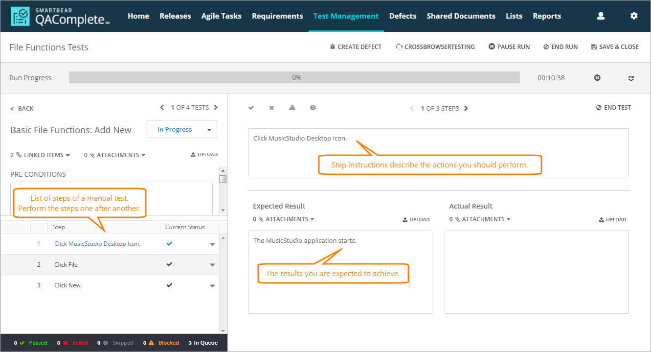 When you run a manual test, the Test Runner shows a list of steps the test contains. Typically, a step gives detailed instructions on what actions should be performed. It can also specify the results you expect to achieve: