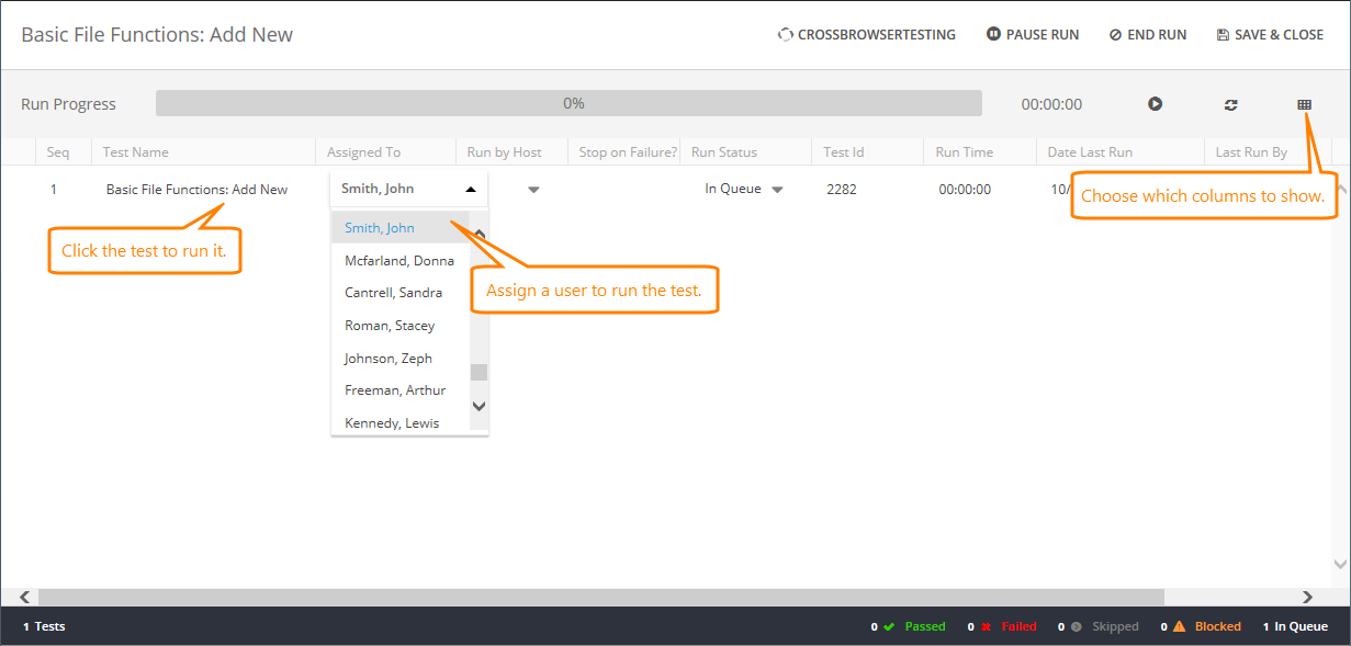 Note: Assigned To is not a required field. It is for reference only. Any team member with the appropriate permission can run a test, and the Test Runner will assign the user who actually ran the test.