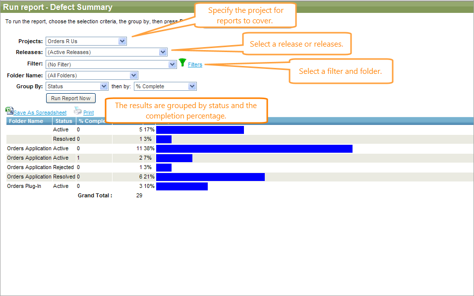 Use Ad Hoc Summary reports to identify the distribution of data for status meetings. Ad Hoc Detail reports are available for various types of items in QAComplete – agile tasks, requirements, defects, and so on.
