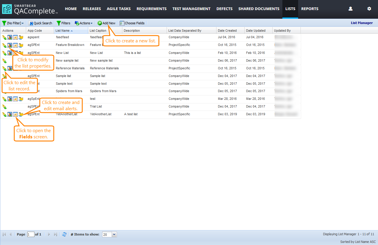 In QAComplete, lists are items you use to track custom information specific to your own business needs – like hardware available in your office with the service keys and warranty information, knowledge base articles, feature areas to use in custom fields, and so on.