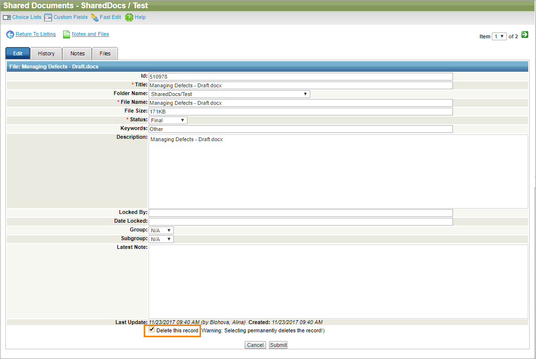 1. On the Shared Documents screen, click the Edit this record icon on the row of the document you want to delete.