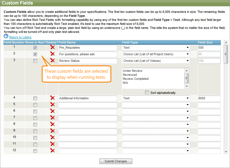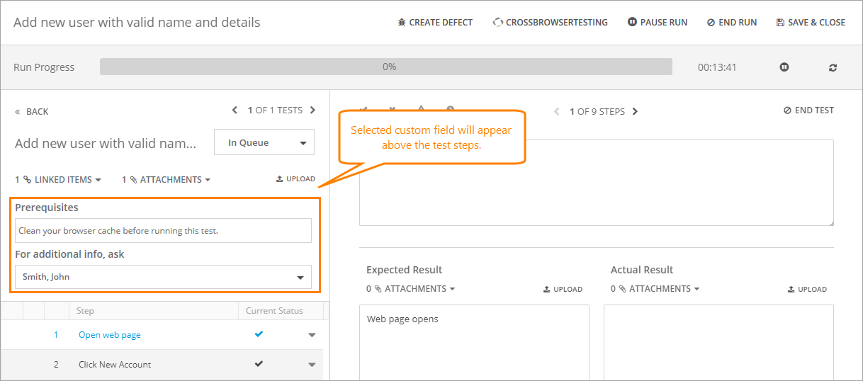 Check a box near the needed field on the Custom Fields screen, and QAComplete will display the data of this field during the test run. This example shows two fields with the Show in Run check box selected. The information from these two fields will appear during the test run.