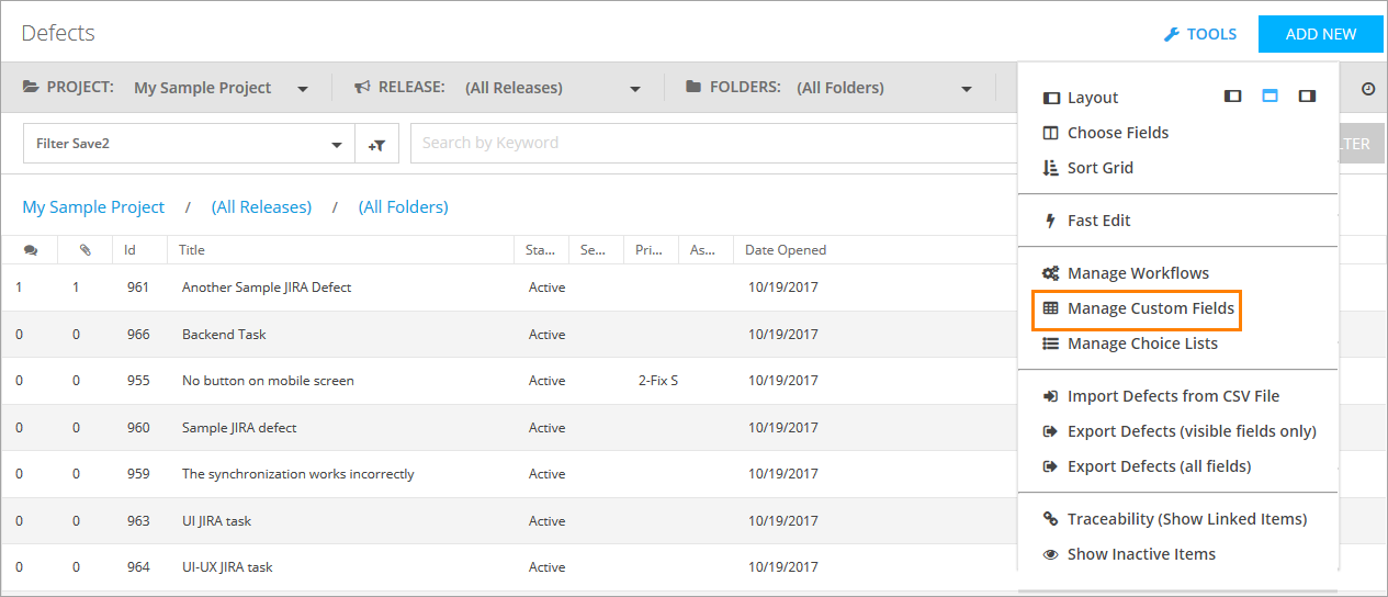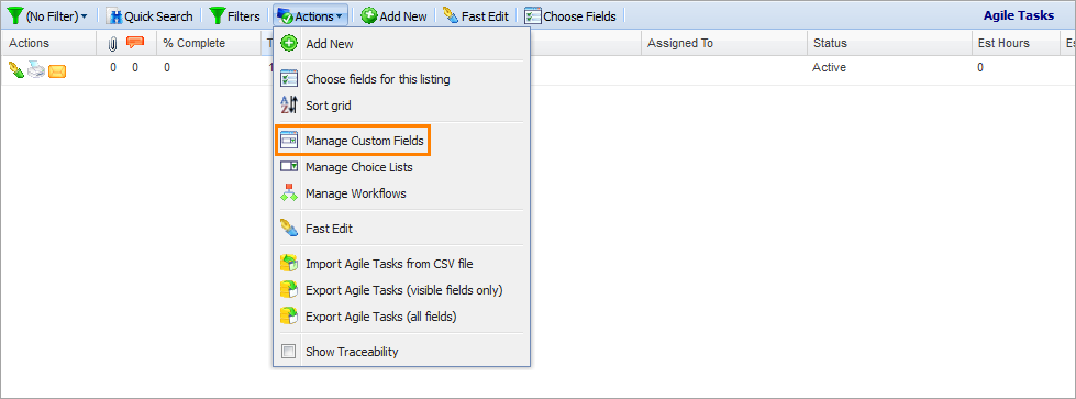 The Manage Custom Fields item in the Actions menu