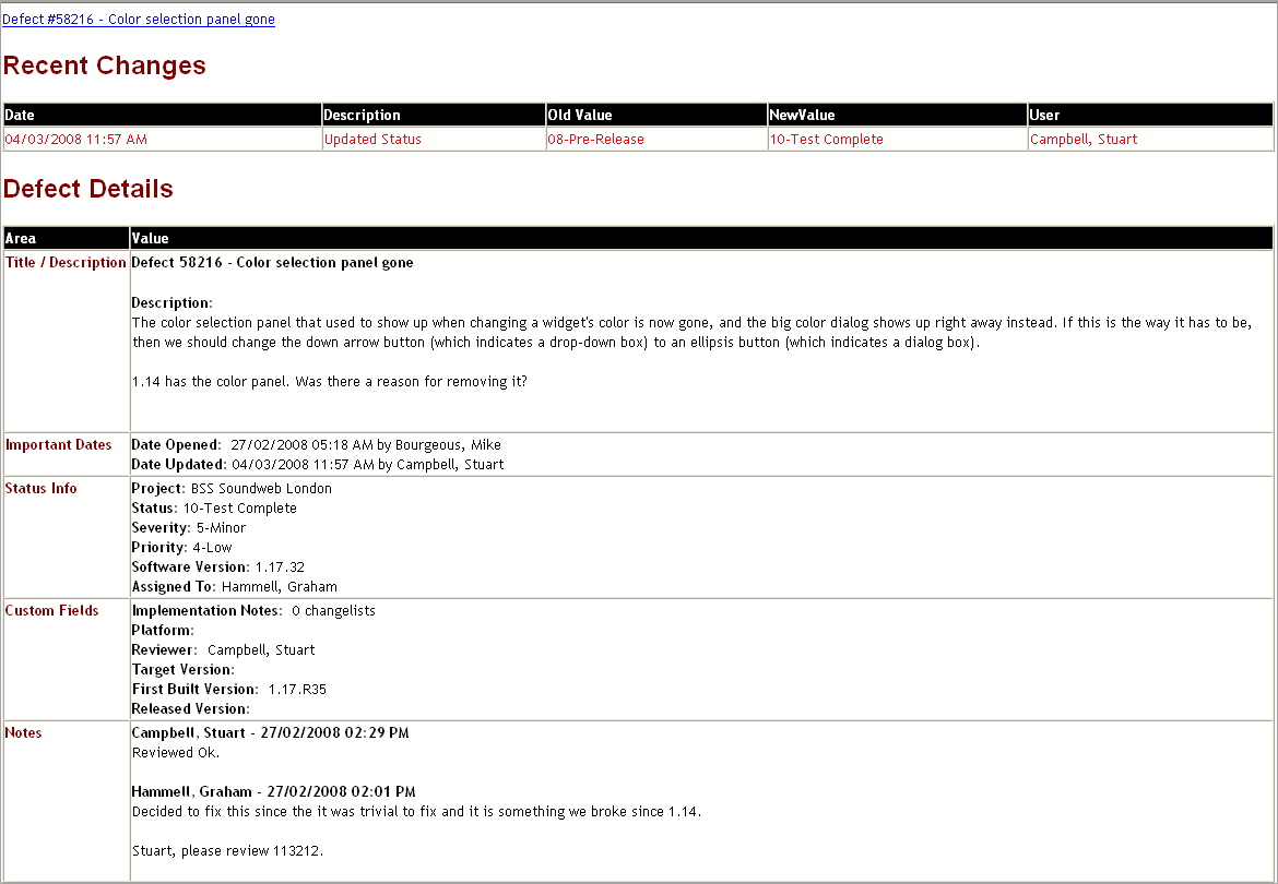 For example, if the Email Alert Subject is Defect {Id} – {Title}, then when the email alert is sent the {Id} and {Title} will be replaced with the actual values for that defect, like in the following example: