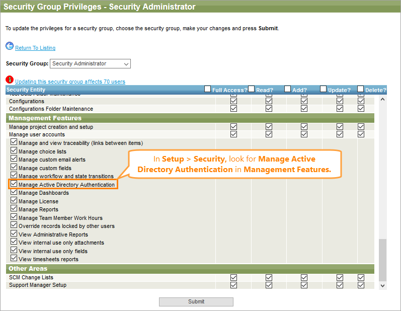 Once the needed permissions have been granted, you will see the Active Directory Authentication Setup item in the Security section.