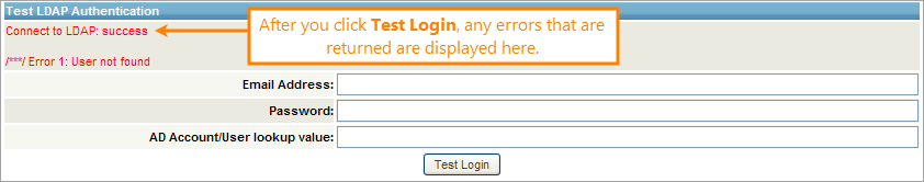 You can check out your Active Directory authentication in the Test LDAP Authentication section, which will return detailed messages about the connection and login.