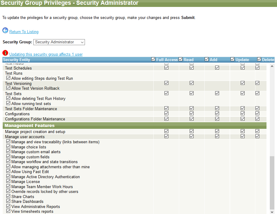 The Management Features section controls the administrative type security settings. Here, you can grant the security group authority to create and maintain projects and user accounts. All users need at least Read privileges to the first two items: Manage project creation and setup and Manage user accounts.