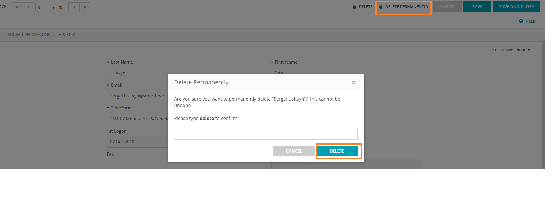 There may be a situation when you want to remove the user record completely. You can do it if the appropriate user has never logged in to the application. Otherwise, if you delete a user who has worked with the application, issues may occur. For example, the Owned By and Updated By fields may be empty for some items.