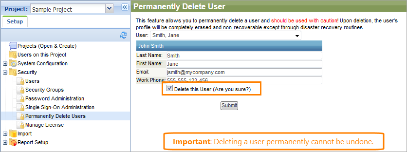 2. Select Security > Permanently Delete Users on the navigation panel on the left.