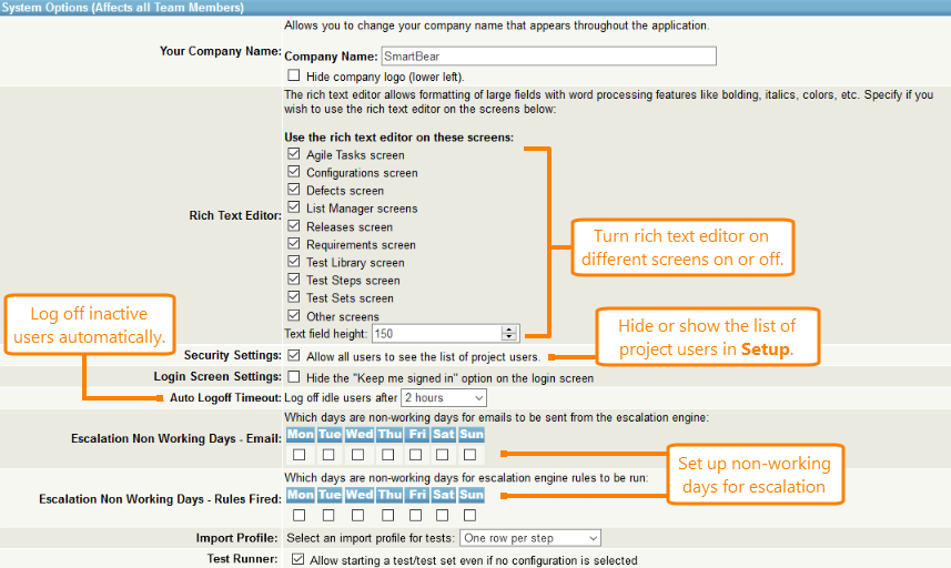 Rich Text Editor – For each module, you can enable the Rich Text formatting for text box fields. To do this, select check boxes for the appropriate screen.