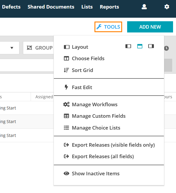 Click  Tools to perform various actions on the Agile Tasks screen: