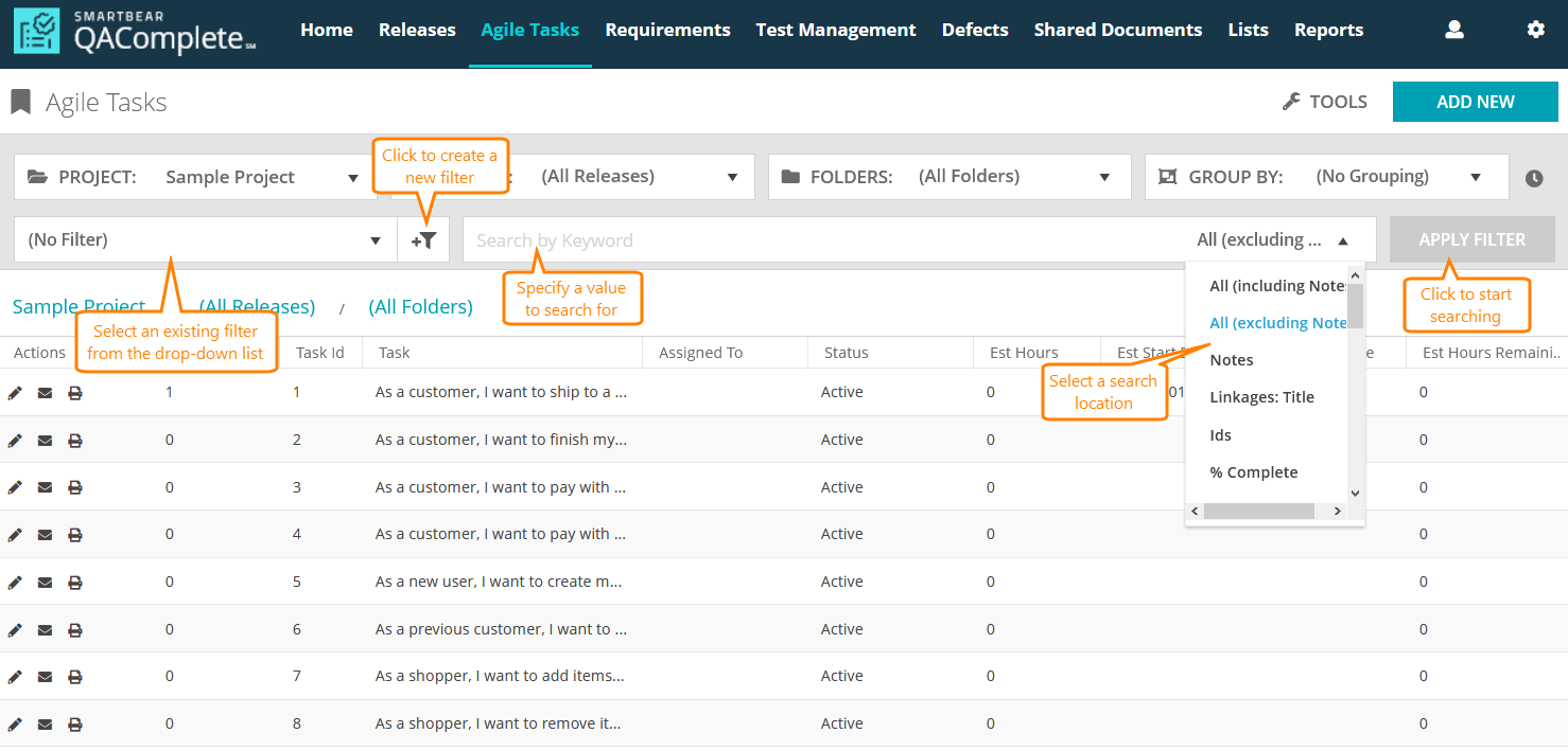 To learn about filtering and the search functionality in QAComplete, see the Search and Filters section.
