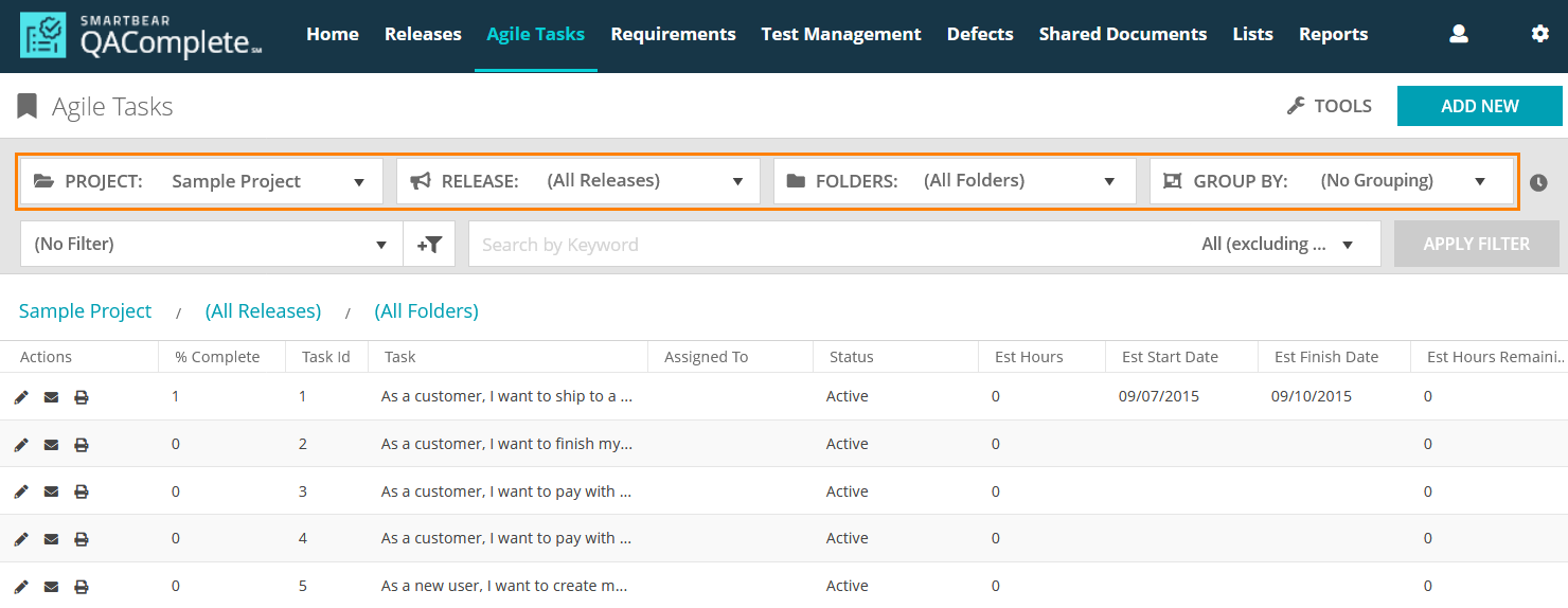 To access this screen, select Agile Tasks > Show Agile Tasks on the main QAComplete toolbar.