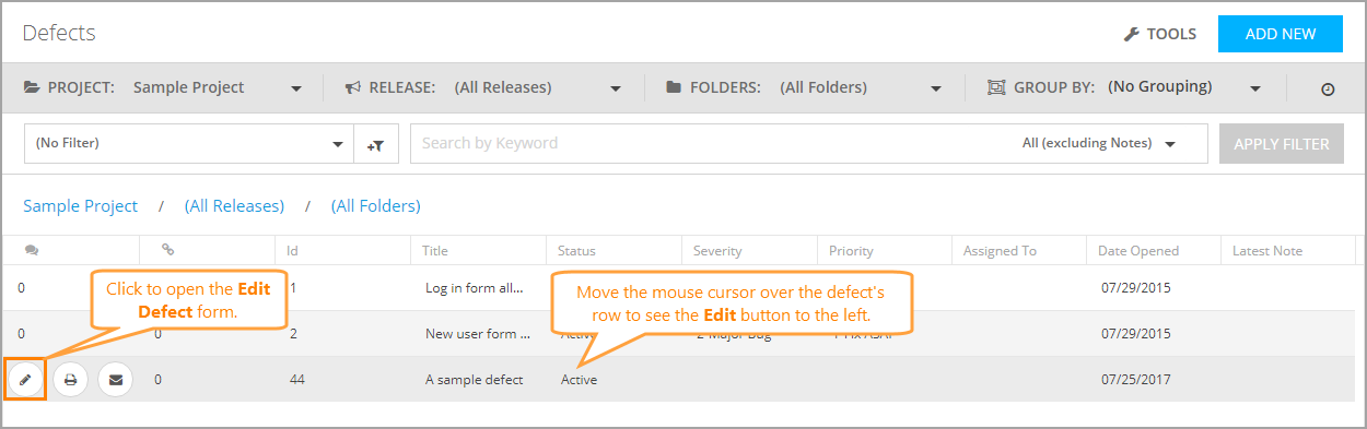 Click the Edit button next to the row of the needed defect to change the defect properties: