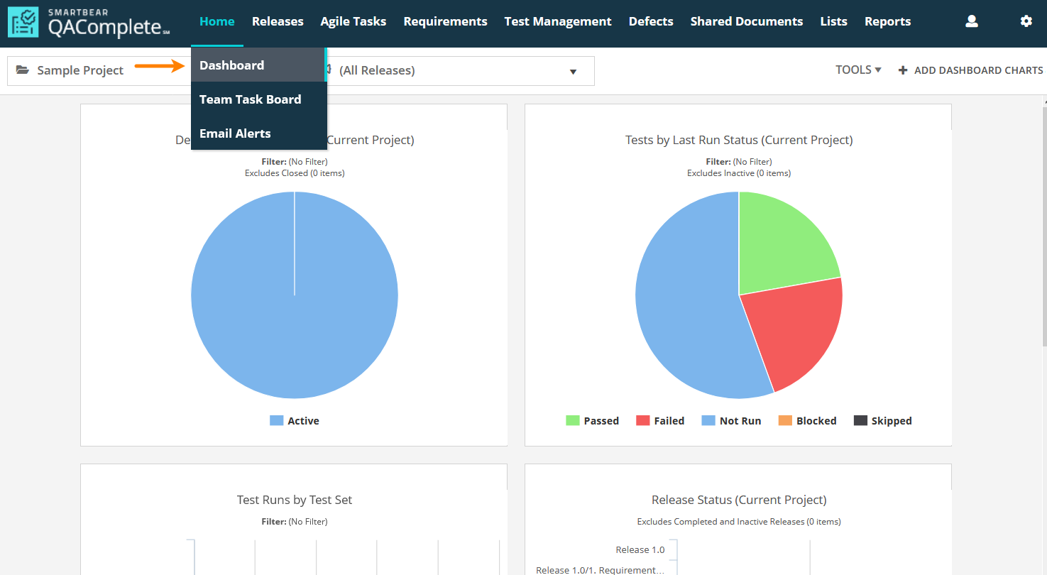 The Dashboards screen appears when you are logging in to QAComplete for the first time. It contains various dashboards: use them to quickly spot trends and inspect statuses of items.