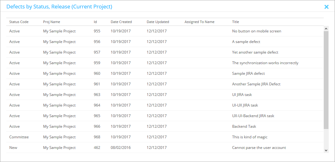 For example, the drill-down screen for Defects by Status, Release looks like this: