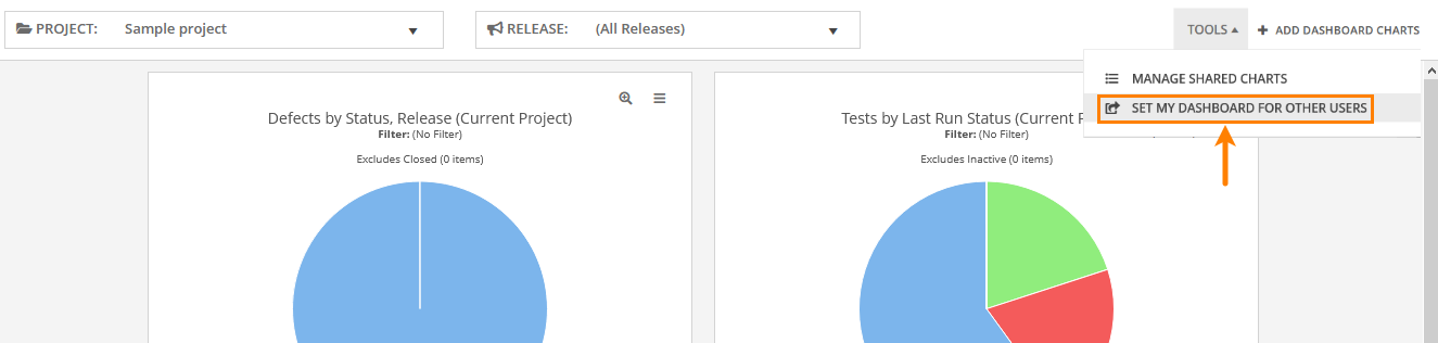 You can set the Dashboards screen layout of your project for other users who also work on this project. In this case, they will not have to manually set up the charts and configure the chart parameters.