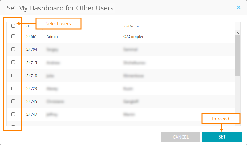 2. In the subsequent dialog, select the check boxes next to the users you want to set the dashboard for:
