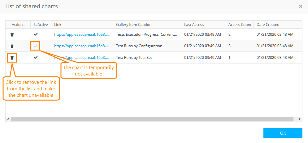 If you want to make a chart temporarily unavailable, disable it in the Is Active column. If you remove a chart from the list, it will become unavailable, and when you share it next time, it will have a different URL.