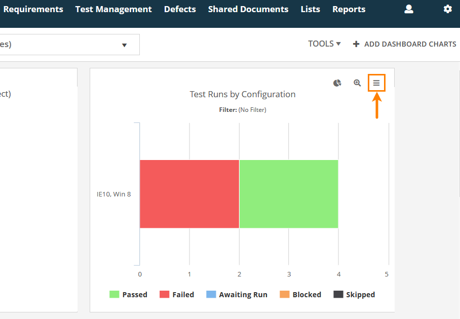 • Test Runs by Configuration — Drillable. Shows all test runs in the current project, sorted by the configuration used to run the test.