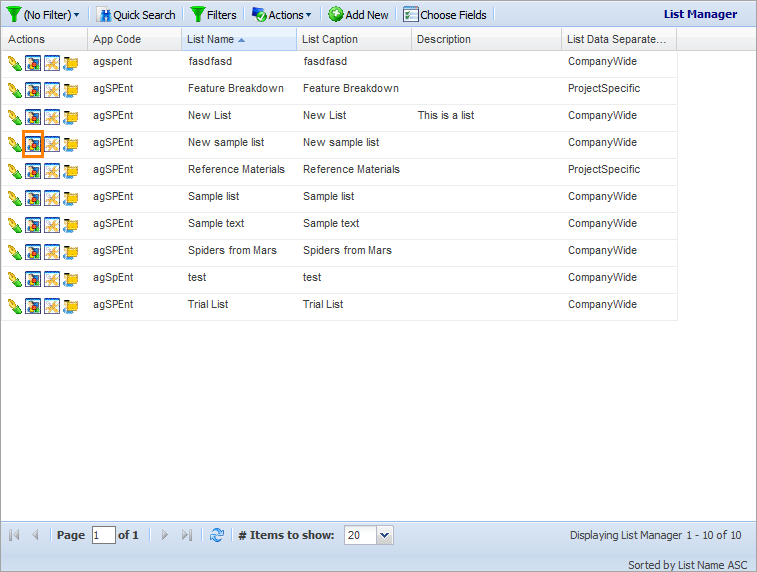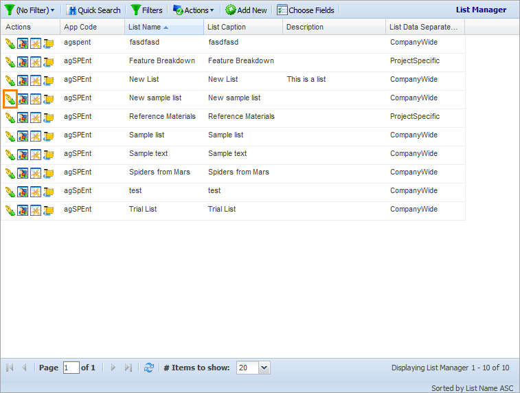 2. On the List Manager screen, click Manage Fields in the Actions column next the list you want to edit.