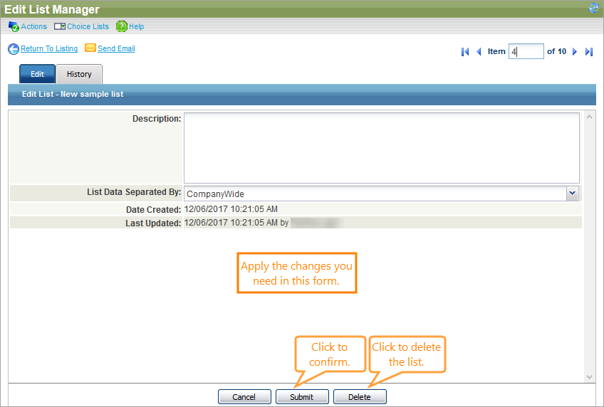 Display History Tab Defines whether the History tab will be displayed on the Edit form for list items.