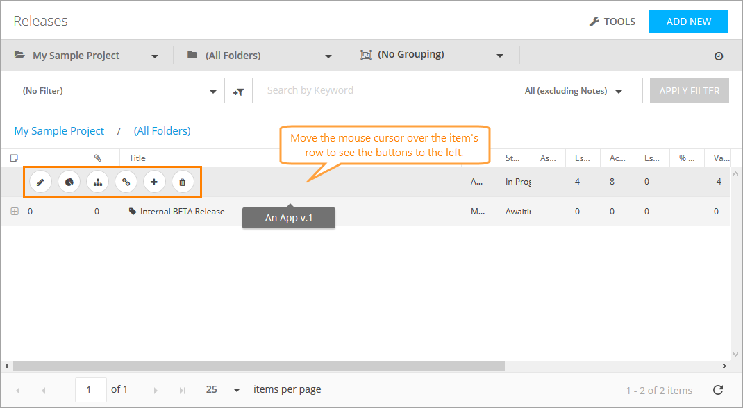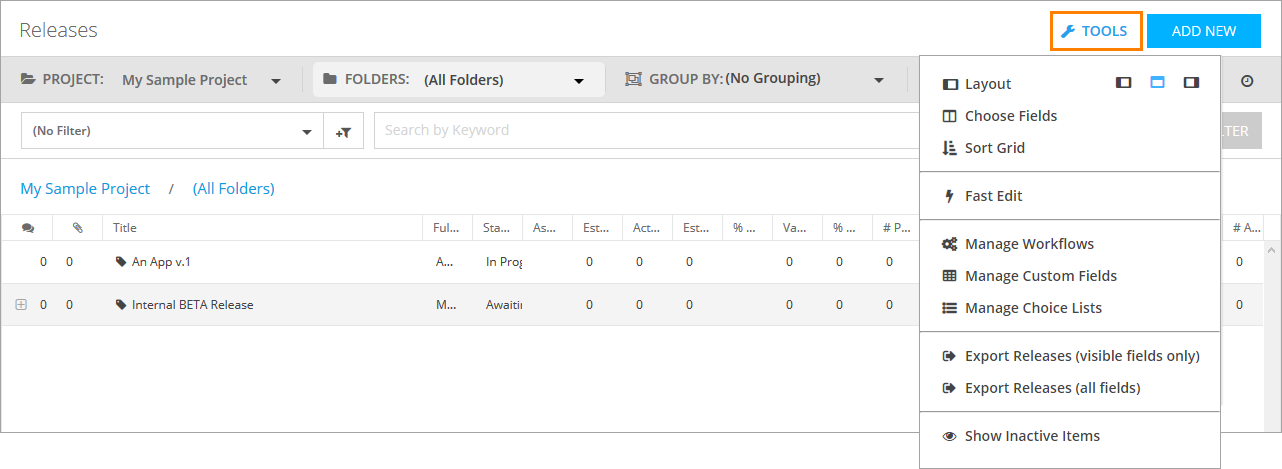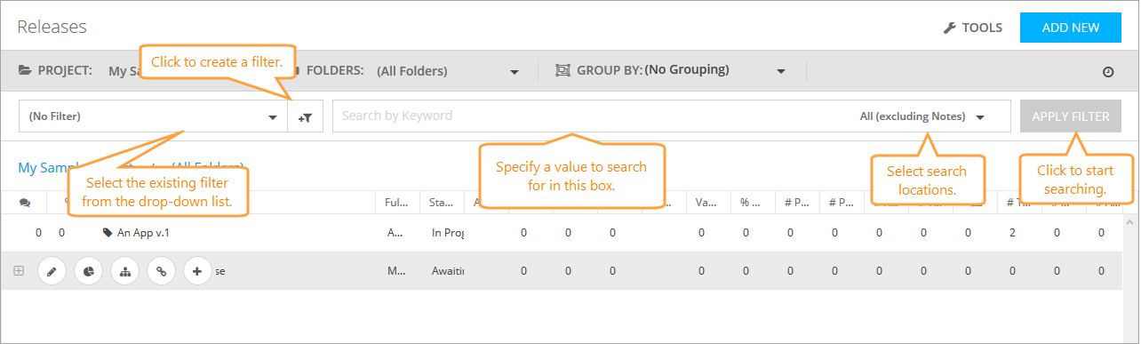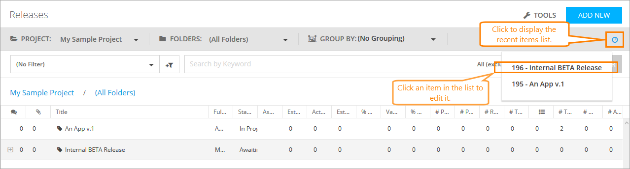 To navigate through available releases, use the Project, Folders, and Grouping drop-down lists on the toolbar.