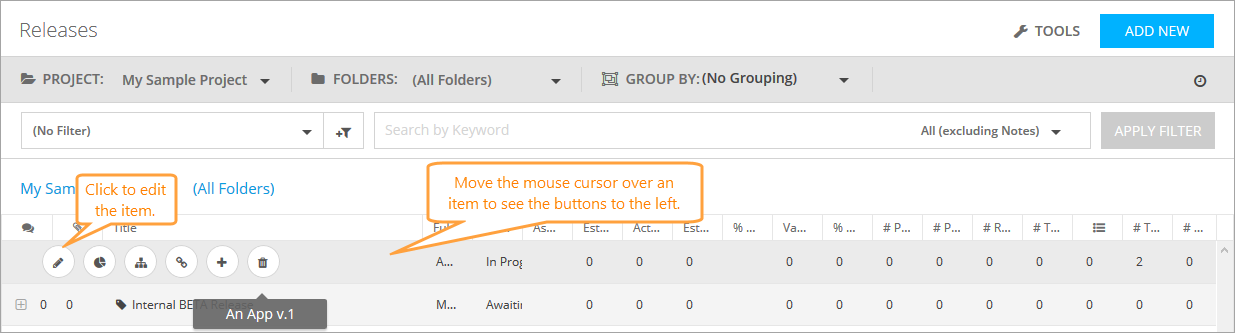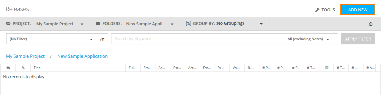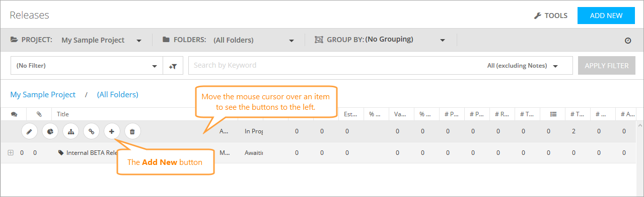 To create iterations or builds, click the Add New button on the row of the release you need child items for: