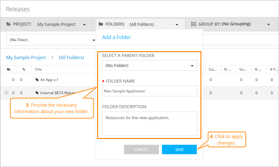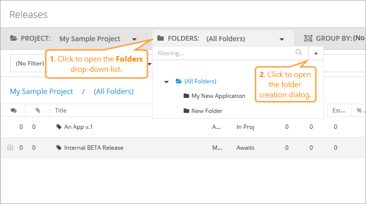 After that, a new folder will be created. You can select it in the Folders drop-down list to associate your newly created releases, iterations, and builds with that folder.