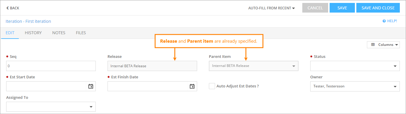 The Create Release form appears with the parent item and release already specified in the Parent Item and Release fields respectively. Provide all the necessary information about the iteration in the fields.