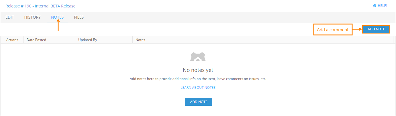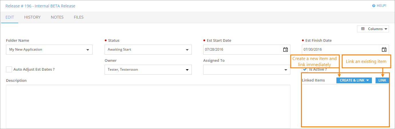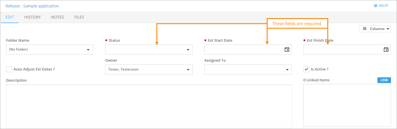 On the Edit form, apply the changes you need to the release, iteration, or build: for example, edit the fields describing the item, attach new mockups and flowcharts, make some comments, and so on. See below for more information.