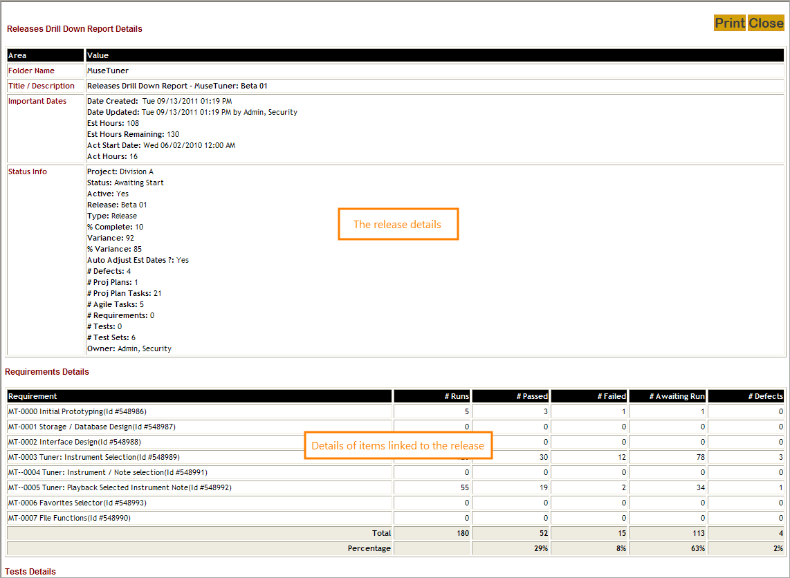 On the Releases screen, you can command QAComplete to generate a drill-down report for a specific release, iteration, or build.