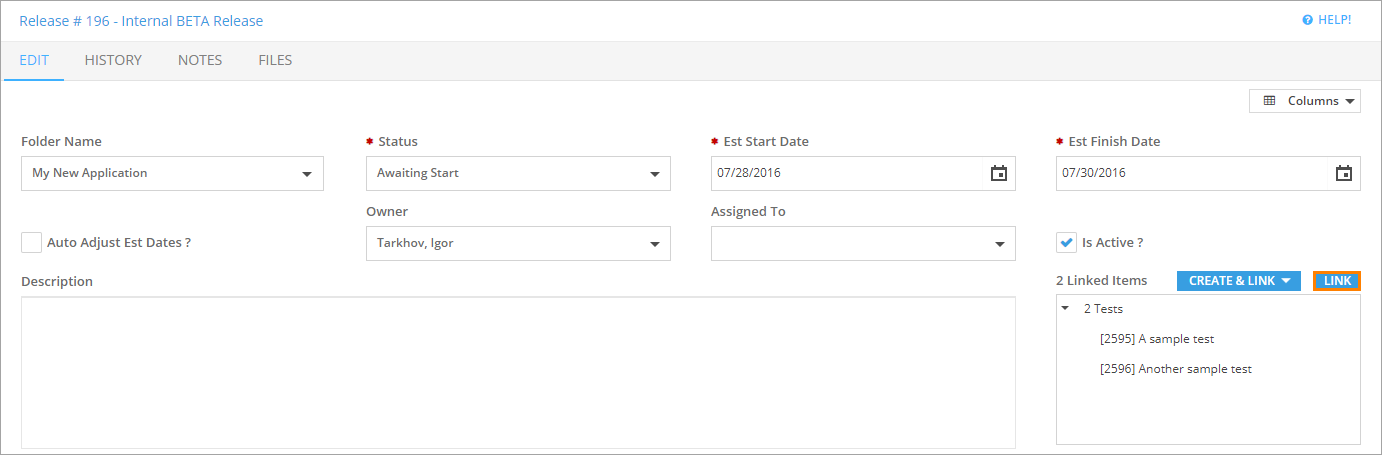 After you define your release, iteration, or build, you can tag requirements, tests, test sets, and defects as belonging to a specific release. You can link these items to a release on the corresponding listing screen (that is, Requirements, Defects, and Test Management Screens) or right away from the Releases screen.